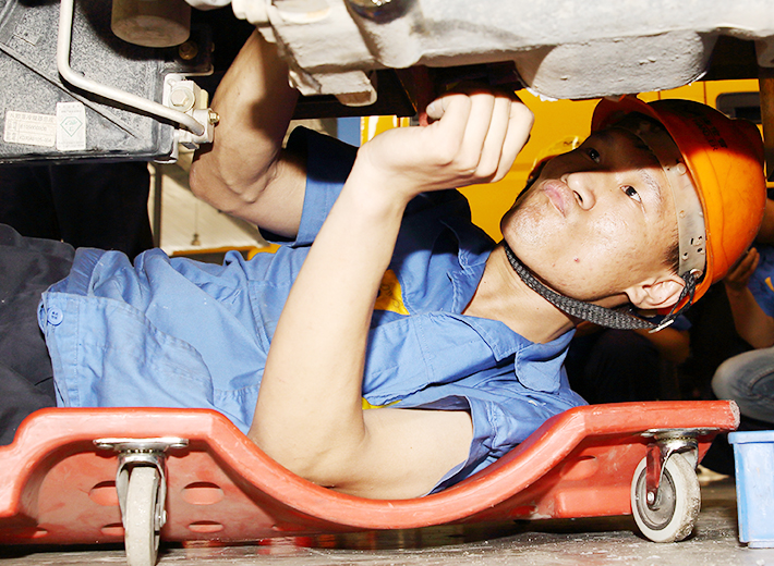 走進裝配車間,你也許很難發現蔡聰的身影,因為他的工作是安裝取力器,需要長時間的在車底作業。
